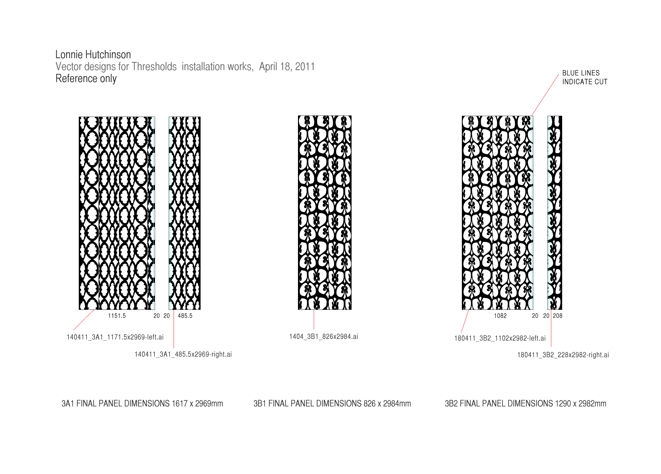 Honoa ki te hono tawhiti also includes motifs from earlier works; many are taken from Hutchinson’s signature cut-out concertina works on black builders’ paper. These designs were flattened and redrawn with consideration to the angles and perspective of a visitor to the space to give the works a three dimensional look and feel. The floor to ceiling curtain forms on the thresholds of levels one and two may appear static at first sight, but the subtle suggestion of movement becomes clear on further investigation. The scale of the design increases from the ground floor threshold to the top threshold.