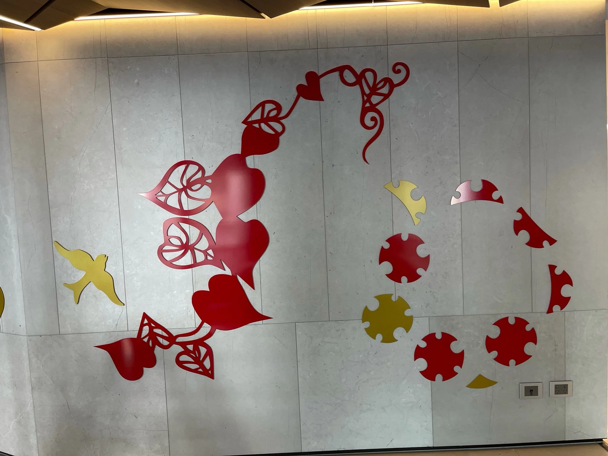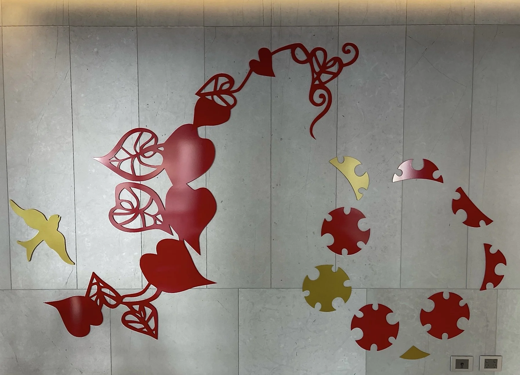 Central to Hutchinson’s work for Cordis Auckland the major wall work Hīkoi Ngahere spans the connecting spaces between the original hotel building and the new Pinnacle Tower. Created from cut-out anodised steel forms, the work is a nature walk that emphasises the landscape of Tāmaki Makaurau, including the native flora of Papatuanuku (earth), Tangaroa (sea), the significant maunga (mountains and extinct volcanoes), and the many puna (springs), streams, waterfalls and tributaries that flow across the land.